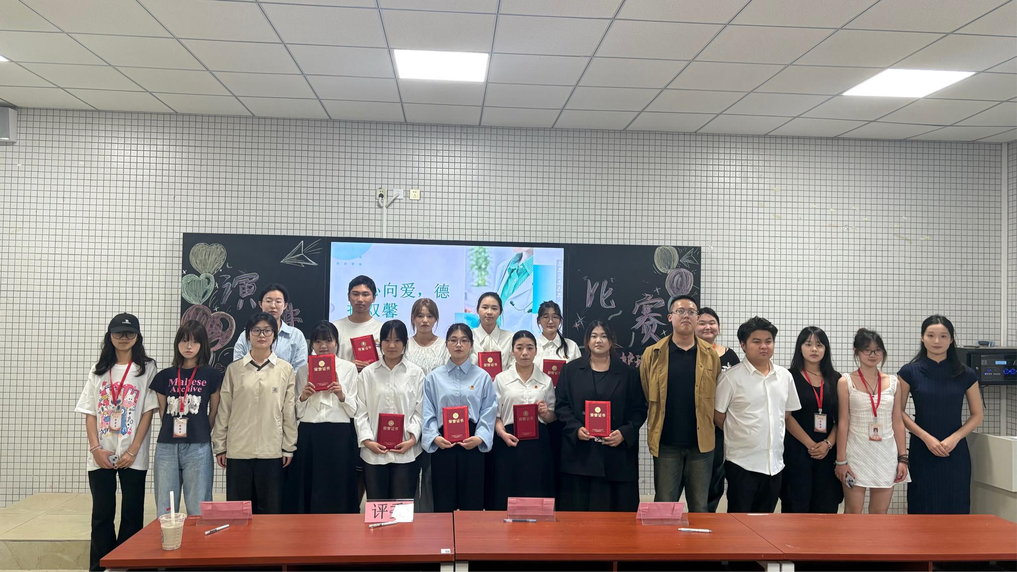 4月27日下午,护理二院在2109教室举办“医心向爱,德技双馨”主题演讲比赛决赛。学院团委书记吕佳继、辅导员邓峻峰陈鸿、刘颖四位评委老师现场坐镇,选手们围绕爱党爱国爱校爱家爱生命的“五爱”精神,结合医护职业使命,以真挚情感和生动案例展现“医心向爱”的初心。