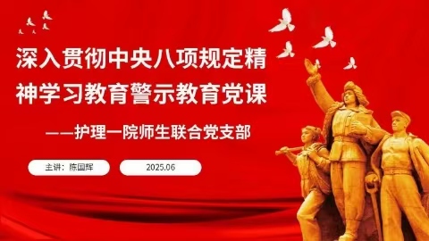 为深化全面从严治党根基,筑牢党员纪律意识与党性修养之基,6月5日下午17时4教103教室,护理一院师生联合党支部精心组织 “深入贯彻中央八项规定精神” 学习教育警示教育党课。本次党课由支部书记陈国辉主讲,支部全体党员、入党积极分子及师生代表共同参与,通过理论学习、案例剖析与实践指引,为师生们带来一场深刻的作风建设思想洗礼。