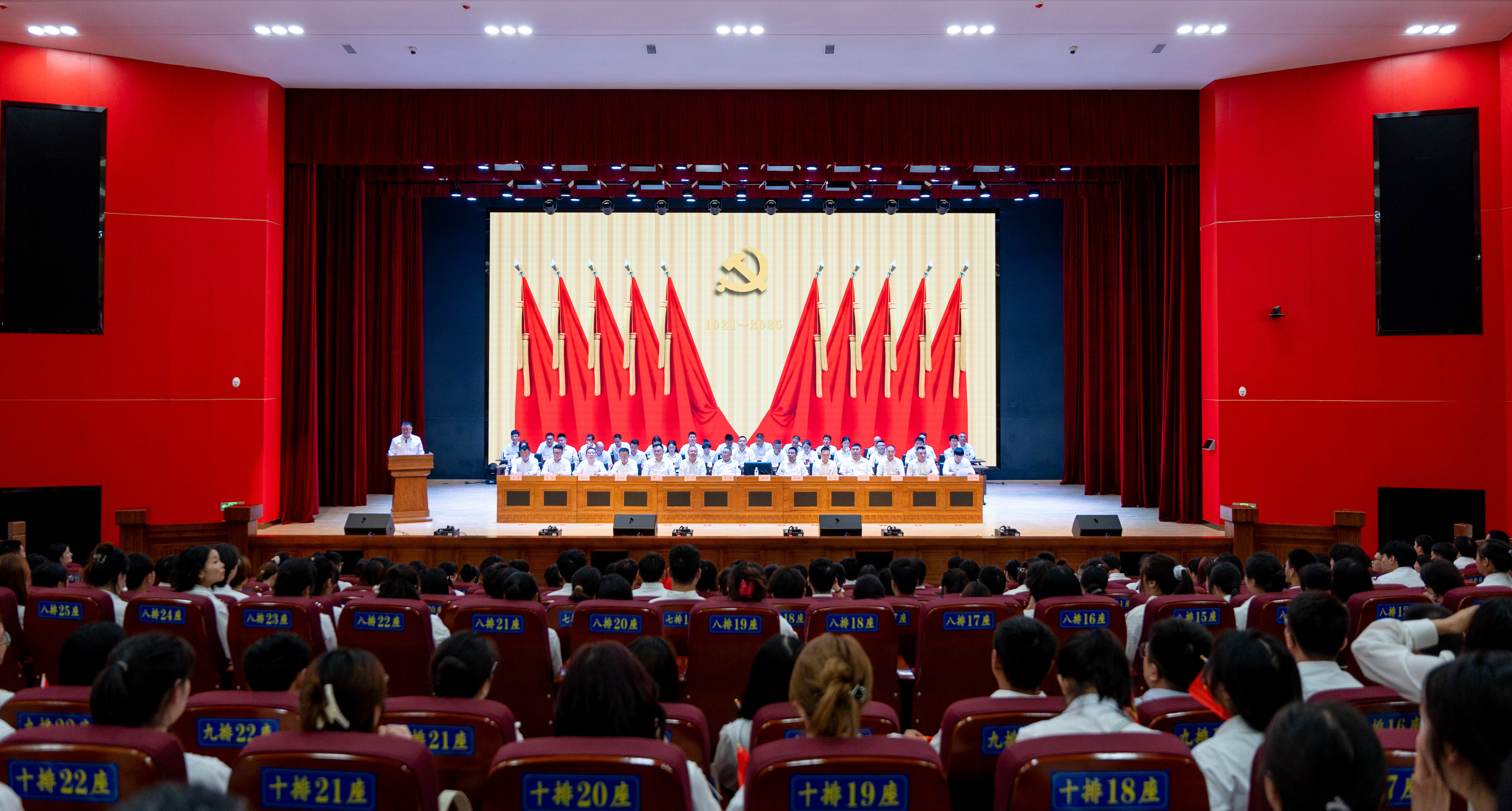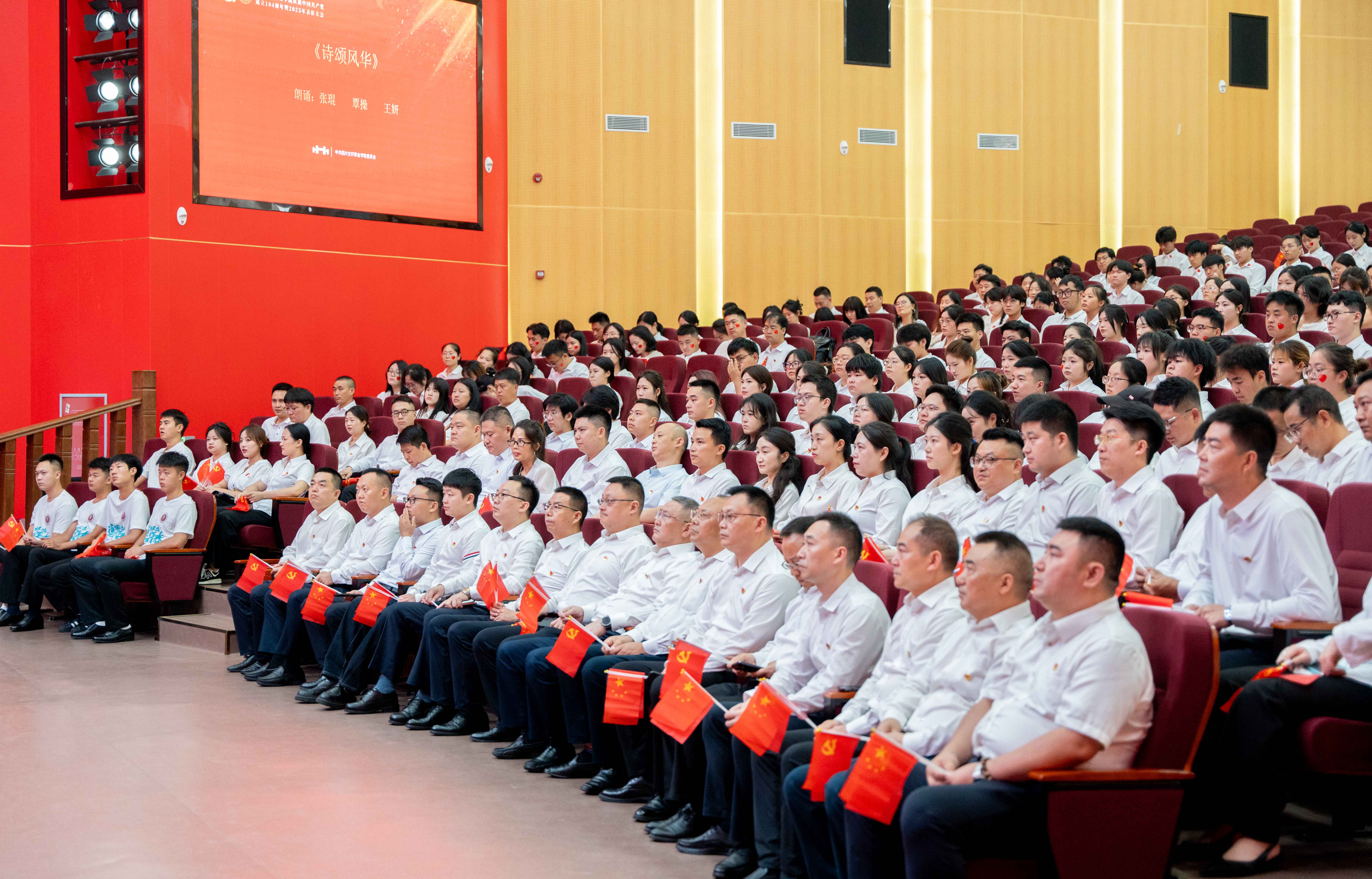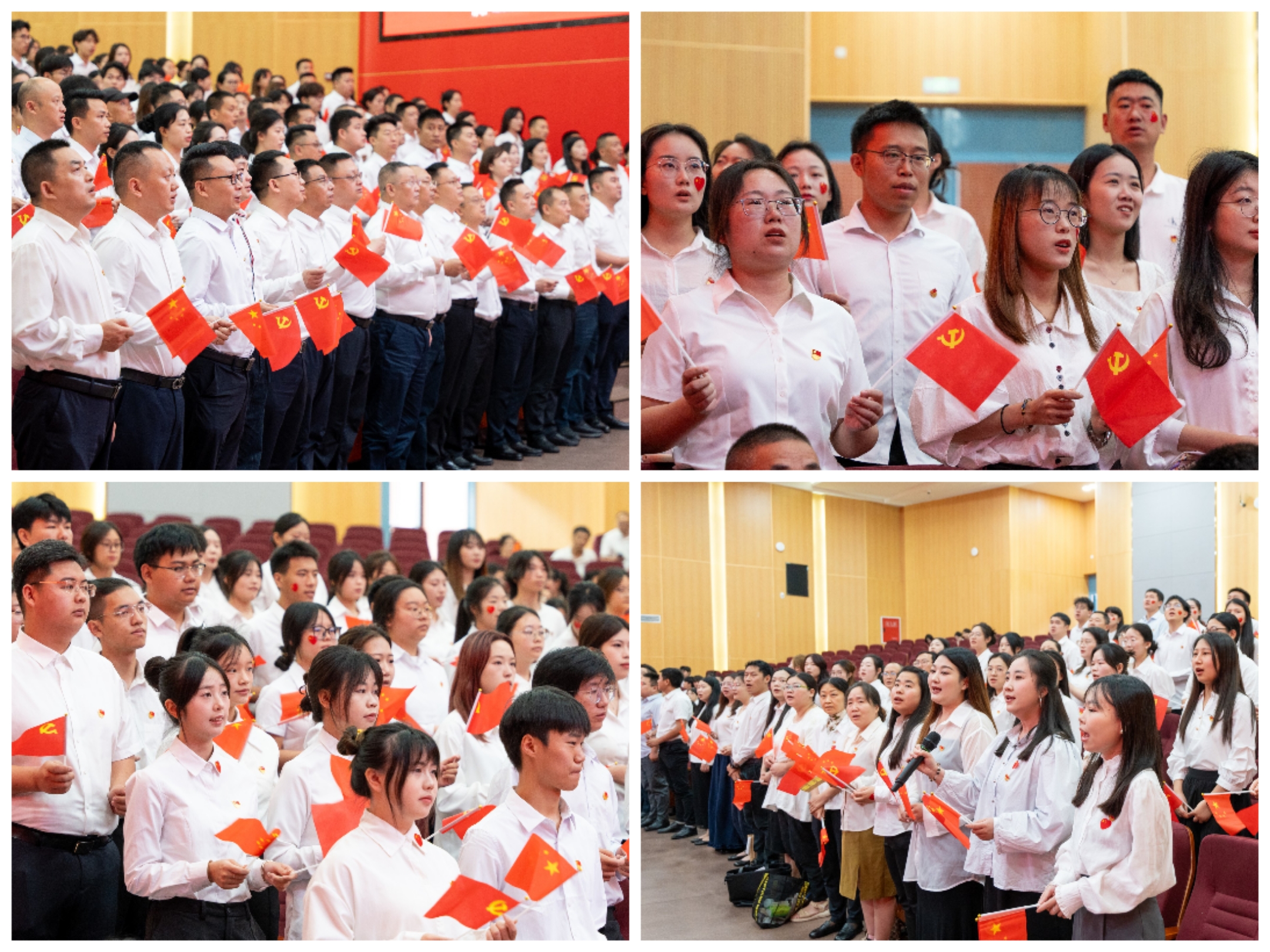 “百年征程风正劲,初心如磐启新程”,大会以诗朗诵《诗颂风华》开篇,回顾了中国共产党从嘉兴南湖的小小红船到领航中国行稳致远的巍巍巨轮的光辉历程,展现了党在百年奋斗中铸就的伟大精神和不朽功勋。随后,全体党员和教师方队、辅导员方队、预备党员方队分别高唱《歌唱祖国》《团结就是力量》《我和我的祖国》《春天的故事》《不忘初心》《我们都是追梦人》,嘹亮歌声表达了对党和祖国的深情礼赞,唱出了全体党员为党育人、为国育才的初心使命与时代担当。