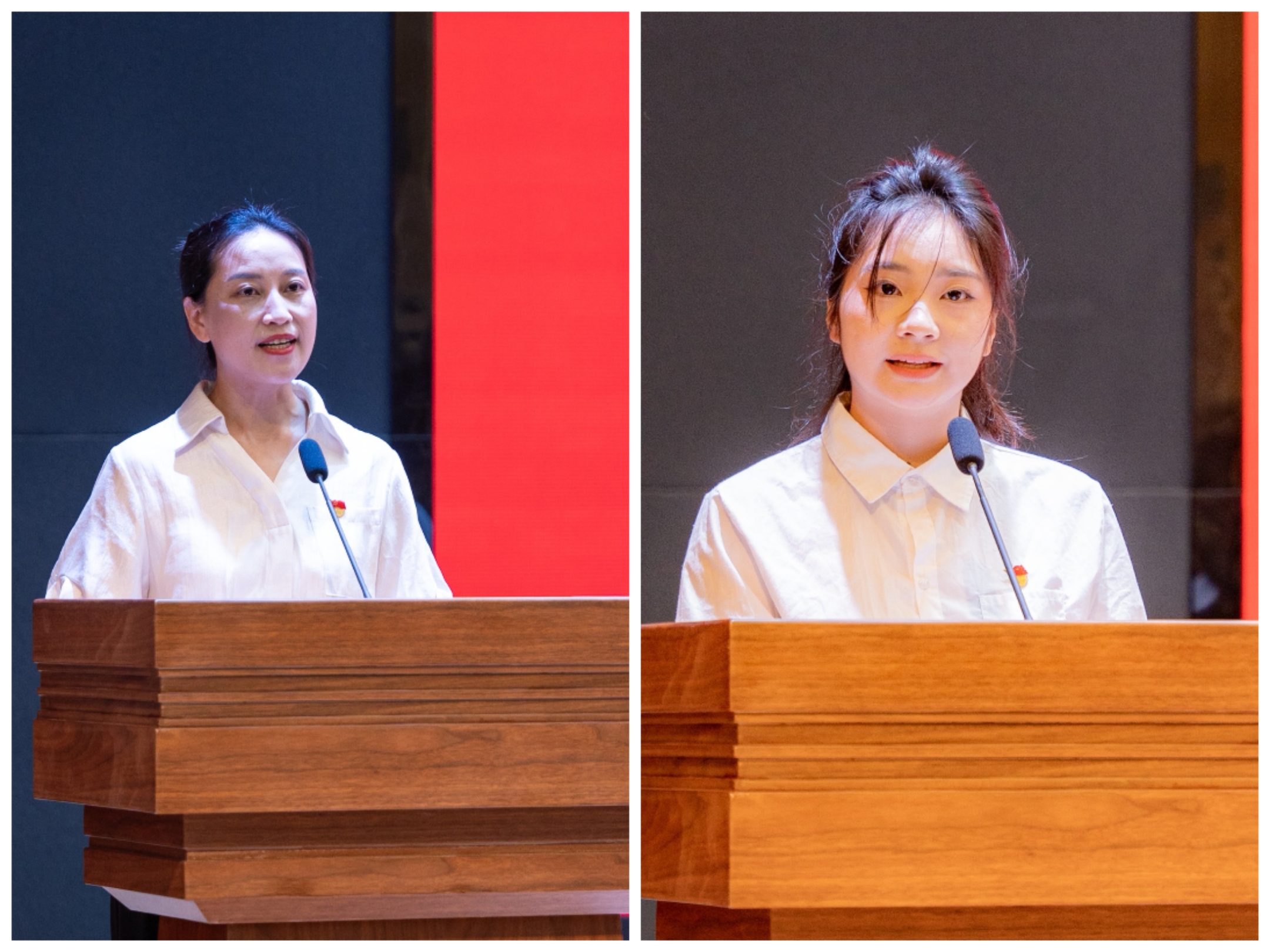 优秀党员代表张春雷在发言中深情回顾了党的光辉历程,分享了自己作为教师党支部书记和教育工作者,始终以优秀党员标准要求自己,坚定理想信念,立足岗位奉献,在日常教育教学中,注重将党的创新理论融入课程,引导学生坚定政治信仰;积极对接国家战略需求,优化专业设置,推动产教融合,为区域经济社会发展培养技术技能人才。预备党员代表、教育学院2023 级学前教育专业学生龙雨涵在发言中说,自己从初入校园时对党的理论学习,到在志愿服务中目睹党员冲锋在前、无私奉献,逐渐坚定了入党信念,作为新时代青年预备党员,将把为人民服务融入日常点滴,用所学专业知识为学生成长筑牢基石,让青春在“强国有我”的奋斗征程中绽放最亮的光。