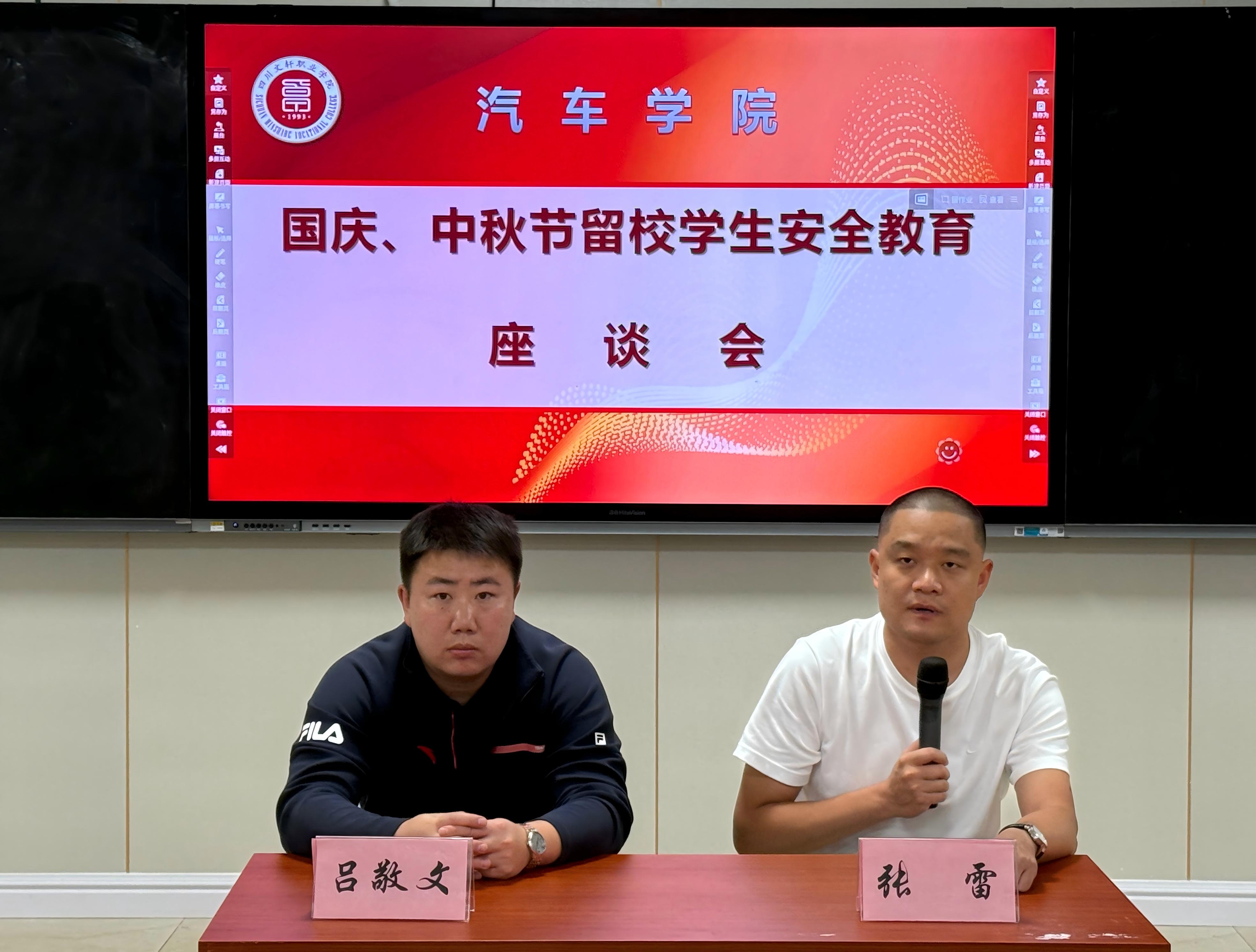 为落实学校假期安全管理工作要求,切实保障留校学生节日期间的学习生活安全,让学子们在校园中感受家的温暖,9 月 29 日 19 时,汽车学院于1 116 教室召开国庆、中秋节留校学生安全教育座谈会。学院副院长张雷办公室主任吕敬文出席会议并讲话,会议由辅导员吉史瓦格主持。