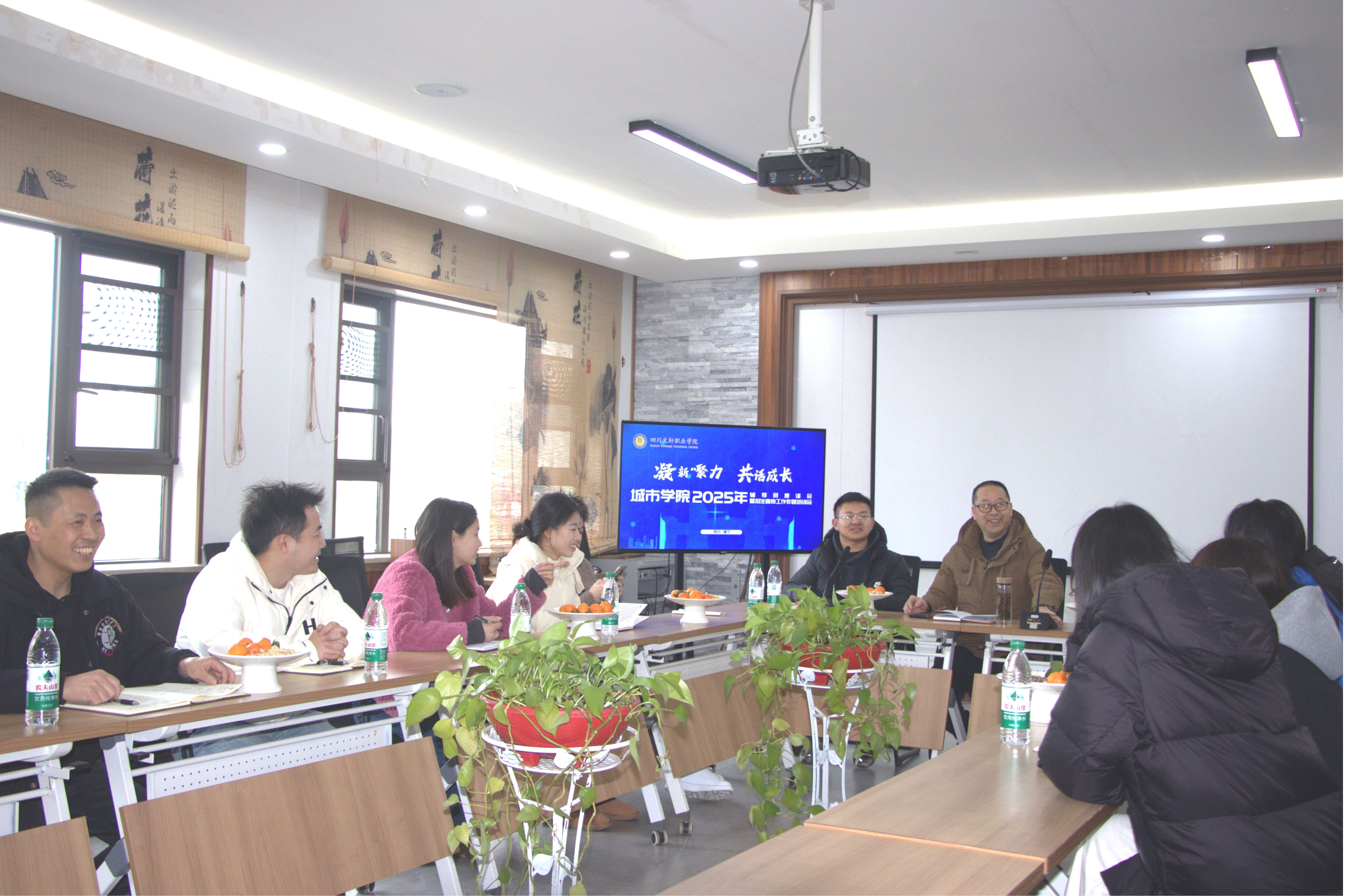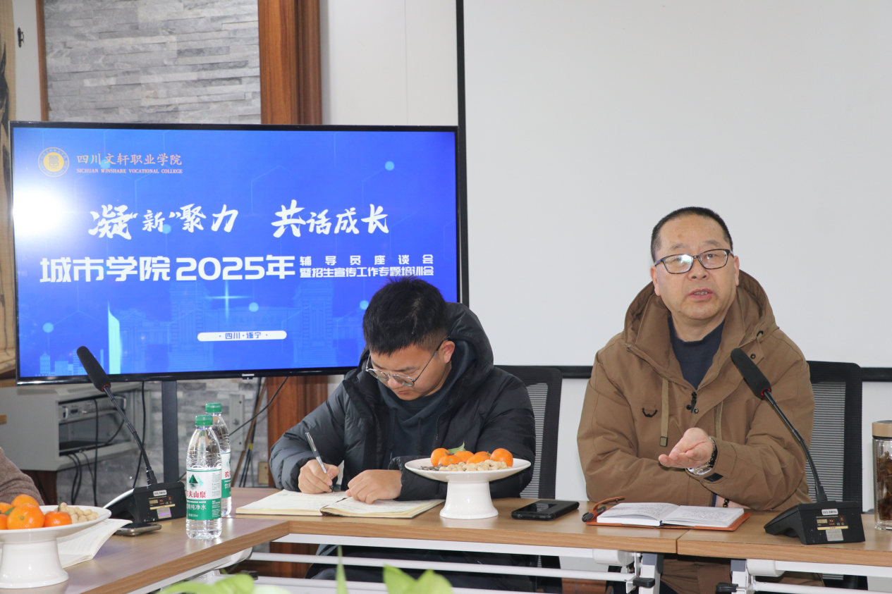 为进一步提升辅导员队伍的整体素质,加强学生管理与服务水平,并为2025年招生工作打下坚实基础,城市学院于2025年1月4日在“绿山微湖”户外研学基地召开了辅导员座谈会暨2025年招生宣传工作专题培训会。会议由学院综合办主任孔德华主持,院长吴应高、副院长谢亮、储备干部、全体辅导员参会。
