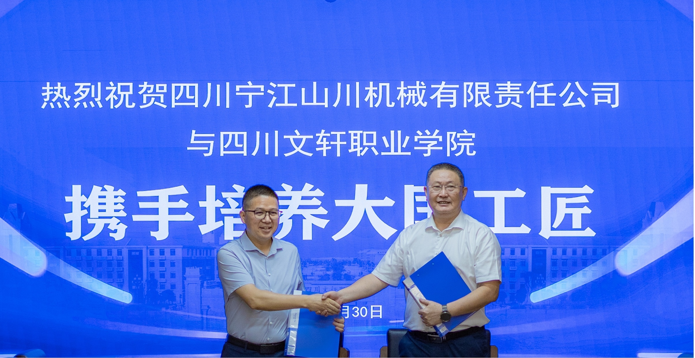 7月30日,我校与中国兵器装备集团四川宁江山川有限责任公司(以下简称“宁江山川”)战略合作签约仪式在遂宁校区举行。宁江山川纪委书记刘华,人力资源部部长祝曦、副部长许玲,学校常务副校长李军,副校长张杳,党委副书记谢林见,校长助理张毅,相关二级学院和部门负责人及学生代表参加会议。副校长潘光林主持会议。